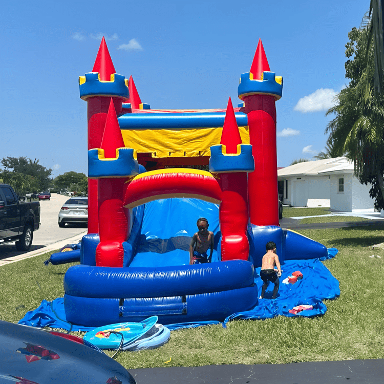 Displaying all of the primary colors, this bounce house is versatile and great for any boy's or girl's party. This unit measures 25'x14' and provides endless entertainment for kids of all ages. Our 25Ft Primary Color Combo is made of flame resistant material, features a safety step up front, rainbow netting, a basketball hoop, a big slide with a safe landing zone and a big bouncing area. One of the most popular bouncy houses, the multi-colored castle has everything you'd want from a basic bouncer. Book now and add one of our Bounce House Rentals take your next party even further!