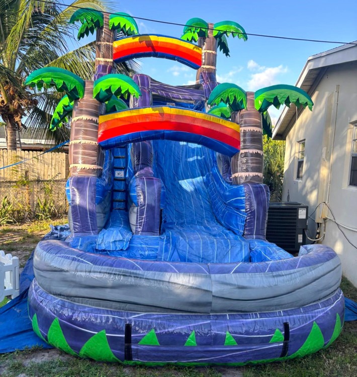 With the palm trees and cool colors, this awesome water slide goes perfect with any ocean or summer party theme. You can say hello to summer with some wet and wild fun with one of our most popular inflatable rentals. This slide is sure to provide refreshing thrills and fun to kids and adults alike.