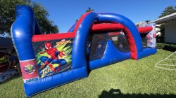 Spiderman 25 Ft Obstacle Course is setup with friendly competition play with entrances and exits. This unit is loaded with vertical and horizontal pop-ups and a pair of tunnels. This inflatable will guarantee family entertainment. This inflatable obstacle course was designed to meet the needs of a customer that wants a nice obstacle course, but has a limited space.