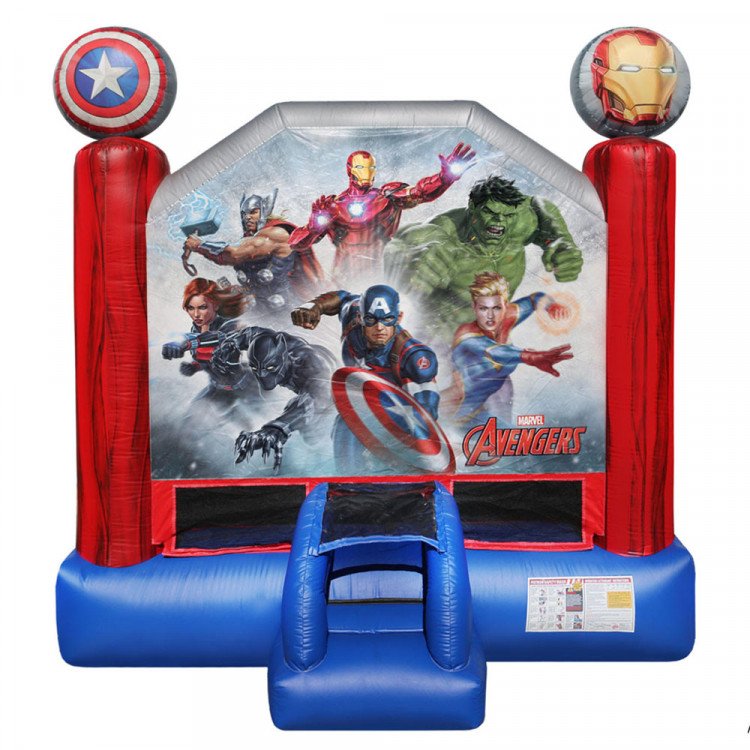 Meet the most powerful heroes on Earth! Have fun with Captain America, Captain Marvel, Iron Man and the rest of the powerful Avengers with Marvel Avengers Superhero Bounce House. The 3D Bounce House designed in the colors red and blue, with the Avengers gathered at the front of the bounce house. It has the Captain America shield and the Iron Man helmet on top of the front pillars. There can be up to 6 heroes at a time to bounce and jump.