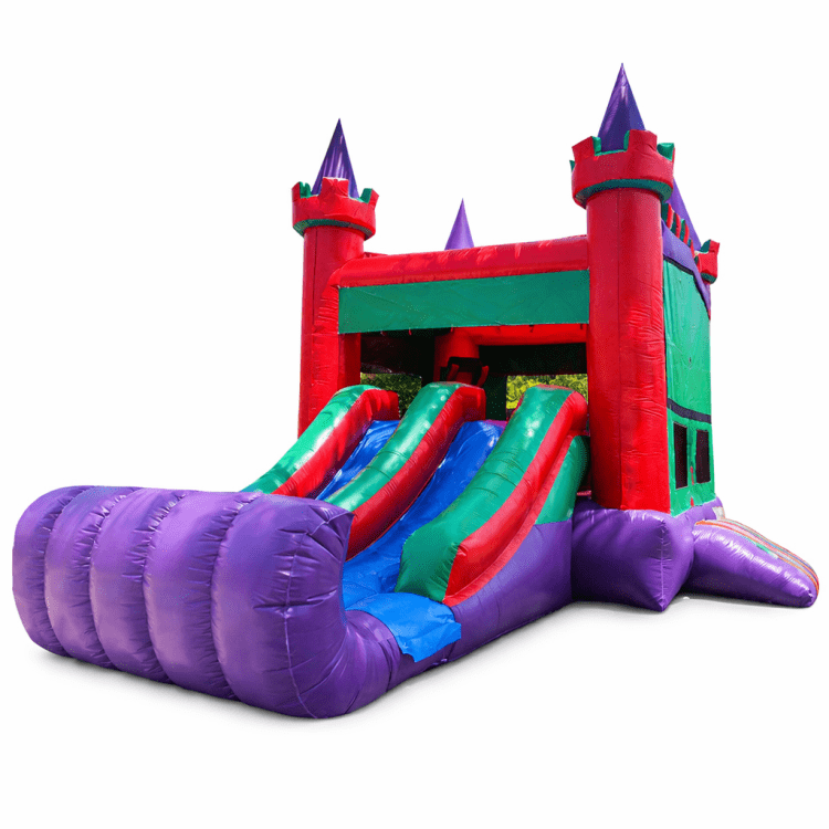 What's better than an Inflatable Bounce House with a Water Slide? How about an Inflatable Bounce House with TWO slides? The Combo Castle 4 In 1 delivers all the fun of a traditional castle bounce house and adds a double lane slide and water slide into the mix for double the fun! Watch two friends crawl into the bouncing area through our upgraded, enclosed tunnel entrance. Have a blast jumping, bouncing and laughing the day before racing up the rock climb wall and each down their own sliding lane to the bottom. It'll be an experience filled with plenty of excitement, laughter and big smiles for the camera.