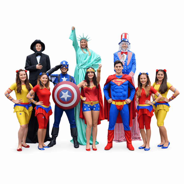 Make your party an unforgettable experience with our two-hour 4th of July Show, featuring an interactive face painting experience followed by an exciting production that includes our 4th of July characters for hire: 1 Host Entertainer and 2 4th of July characters. Our experienced performers will transform your child and their friends into their favorite 4th of July characters with our face painting for the first hour of the party.